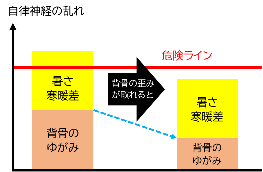 もともと背骨の歪みで自律神経が乱れていると、気温の変化による自律神経の乱れも加わって危険な水準となり、様々な不調となって出てしまうのです。
